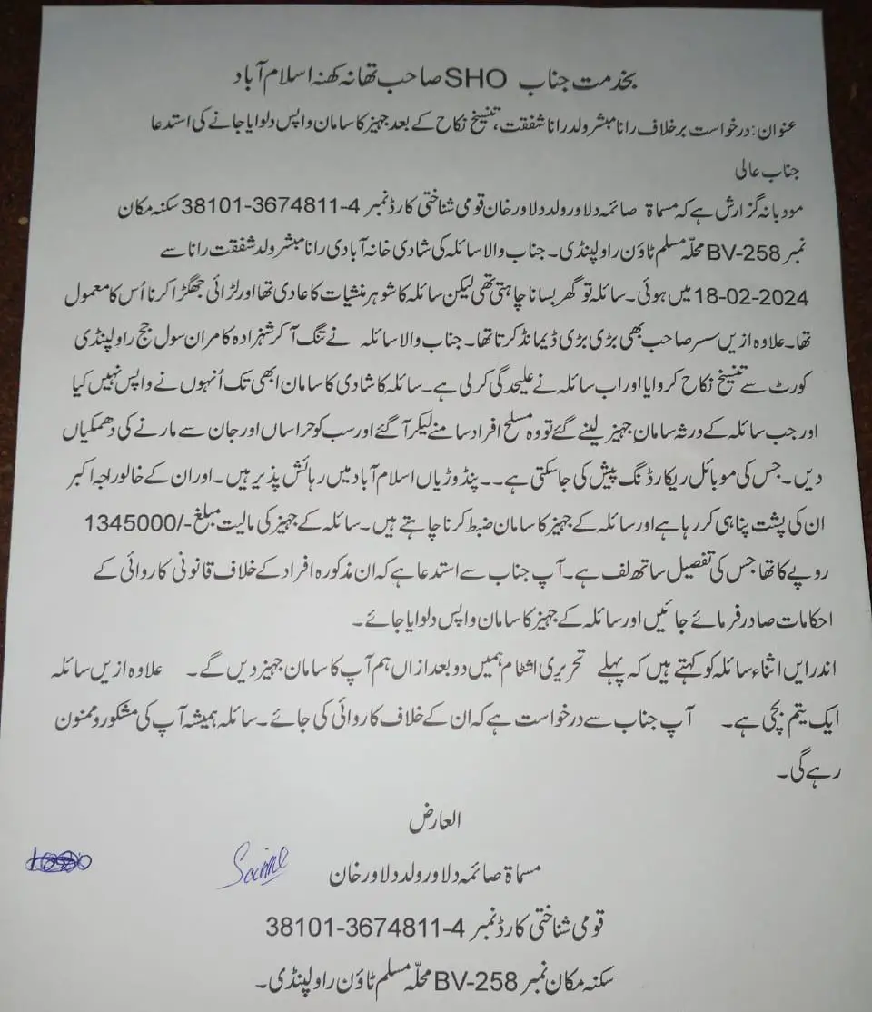 اسلام آباد: (راشد ستی) ایک یتیم بیوہ لڑکی مبینہ ظلم و جبر کا شکار ہو کر دربدر کی ٹھوکریں کھانے پر مجبور ہے۔متاثرہ خاتون نے بتایا کہ شادی کے صرف دو ماہ بعد شوہر کے نشے کی لت کے باعث علیحدگی اختیار کرنا پڑی۔بعدازاں عدالت کے ذریعے بعذریہ تنسیخِ نکاح حاصل کی گئی۔متاثرہ خاتون نے محنت مزدوری اور نوکری کر کے اپنے لیے جہیز کا سامان جمع کیا۔مبینہ طور پر سابق شوہر رانا مبشر ولد رانا شفقت نے جہیز کا تمام سامان اپنے قبضے میں لے لیا۔سامان واپس مانگنے پر جان سے مارنے کی دھمکیاں دی گئیں۔متاثرہ خاتون انصاف کے لیے تھانہ کھنہ پہنچی مگر تاحال کوئی کارروائی نہ ہو سکی۔خاتون کے مطابق ملزم نے گرفتاری سے بچنے کے لیے اپنا مکان بھی تبدیل کر لیا ہے۔متاثرہ خاتون نے آئی جی اسلام آباد سے تحفظ فراہم کرنے کا مطالبہ کیا ہے۔ان کا کہنا ہے کہ مجھے جان و مال کا تحفظ دیا جائے اور میرا جہیز کا سامان واپس دلوایا جائے۔
