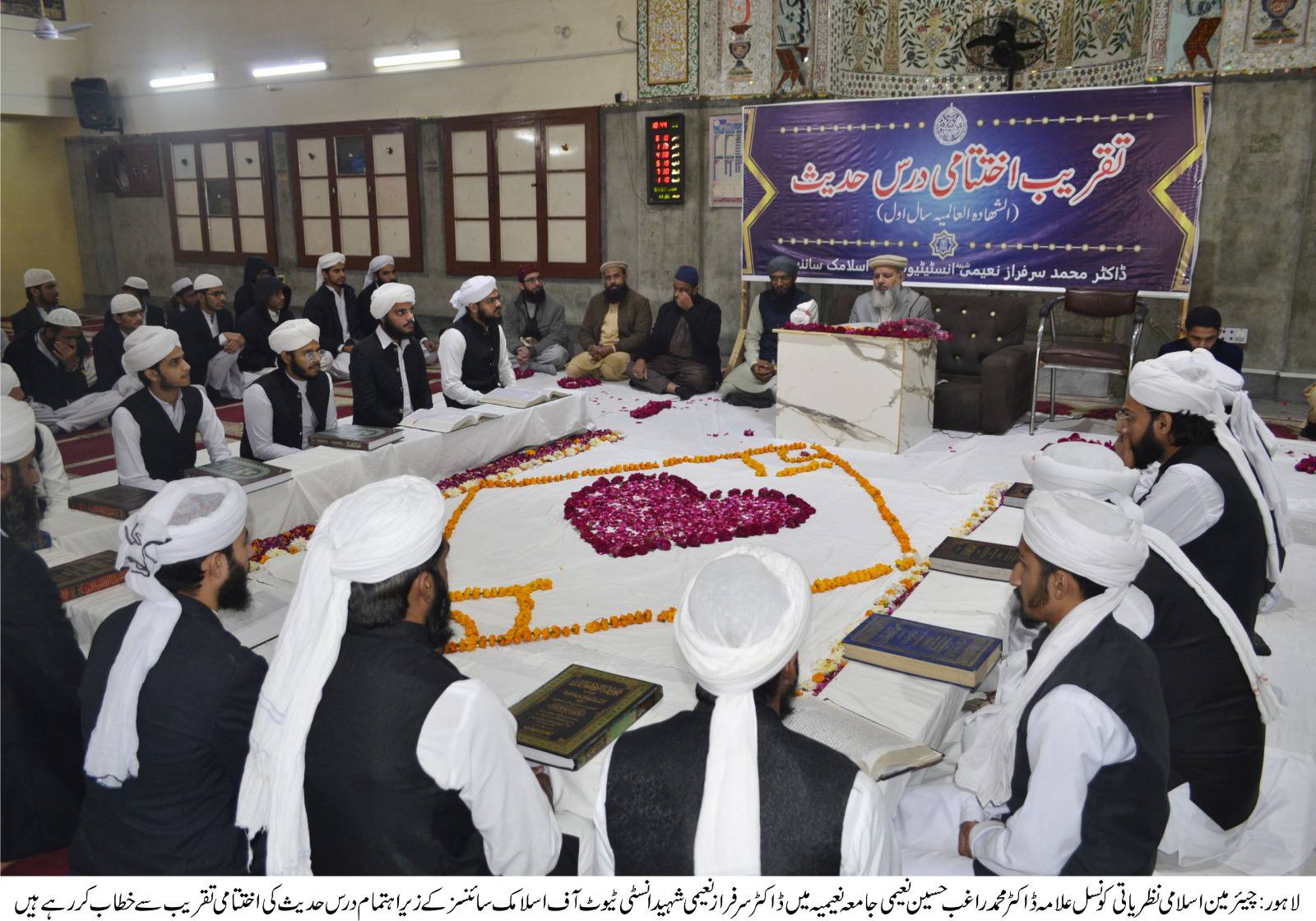 چیئرمین اسلامی نظریاتی کونسل علامہ ڈاکٹرمحمدراغب حسین نعیمی نے کہاہے کہ اصلاح معاشرہ کیلئے سیرت النبی ؐ کاپیغام عام کرناہوگا۔سیرت النبی ﷺ کی پیروی سے ہی فرد اور معاشرہ دونوں کی اصلاح ممکن ہے۔نبی اکرم ﷺ نے ہمیشہ انسانیت کے حقوق کا خیال رکھا، مظلوموں کی مدد کی اور امن کی اہمیت پر زور دیا۔ان خیالات کااظہار انہوں نے دارالعلوم جامعہ نعیمیہ میں ڈاکٹرسرفراز نعیمی شہیدانسٹی ٹیوٹ آف اسلامک سائنسزکے زیراہتمام درس حدیث کی اختتامی تقریب سے خطاب کرتے ہوئے کیا۔تقریب میں معروف سیرت نگارڈاکٹرطارق شریف زادہ،مفتی سخاوت منیر،مفتی بلال فاروق نعیمی،مفتی محمود انور،مولاناعامر سلمان،مولانامسعود احمد سیالو ی، قاری ذوالفقارنعیمی،مولانا محمدسلیم نعیمی،مولانا محمدعلی بٹ،مفتی شہزاد احمدنعیمی سمیت ادارے کے اساتذہ وطلبہ نے بھرپور شرکت کی۔ چیئرمین اسلامی نظریاتی کونسل علامہ ڈاکٹر محمد راغب حسین نعیمی نے طلبہ کو درس حدیث دیتے ہوئے معاشرتی رسومات اوراسلام کی حقیقی تعلیمات پرروشنی ڈالی۔انہوں نے کہامزیدکہ صدقہ اسلام کا ایک نمایاں اقتصادی اور اخلاقی تصور ہے۔ یہ صرف مالی امداد نہیں، بلکہ ایک روحانی تزکیہ کا ذریعہ بھی ہے۔ صدقہ صرف مال دینا ہی نہیں بلکہ مسکرا کر بات کرنا، راستے سے تکلیف دہ چیز ہٹانا اور کسی کو اچھا مشورہ دینا بھی صدقہ ہے۔ اسلام نے صدقہ کو غربت کے خاتمے، دلوں کی نرمی اور معاشرتی عدل کے قیام کا ذریعہ قرار دیا ہے۔مسلمان رسومات کے بجائے نبی کریم ؐ کی تعلیمات پر عمل پیرا ہوں۔سیرت النبیؐ ایک مکمل ضابطہ حیات ہے جو انسانیت کی فلاح کے لیے بہترین رہنمائی فراہم کرتی ہے۔تقریب کے اختتام پر ملک وقوم کی سلامتی کیلئے خصوصی دعا کرائی گئی۔