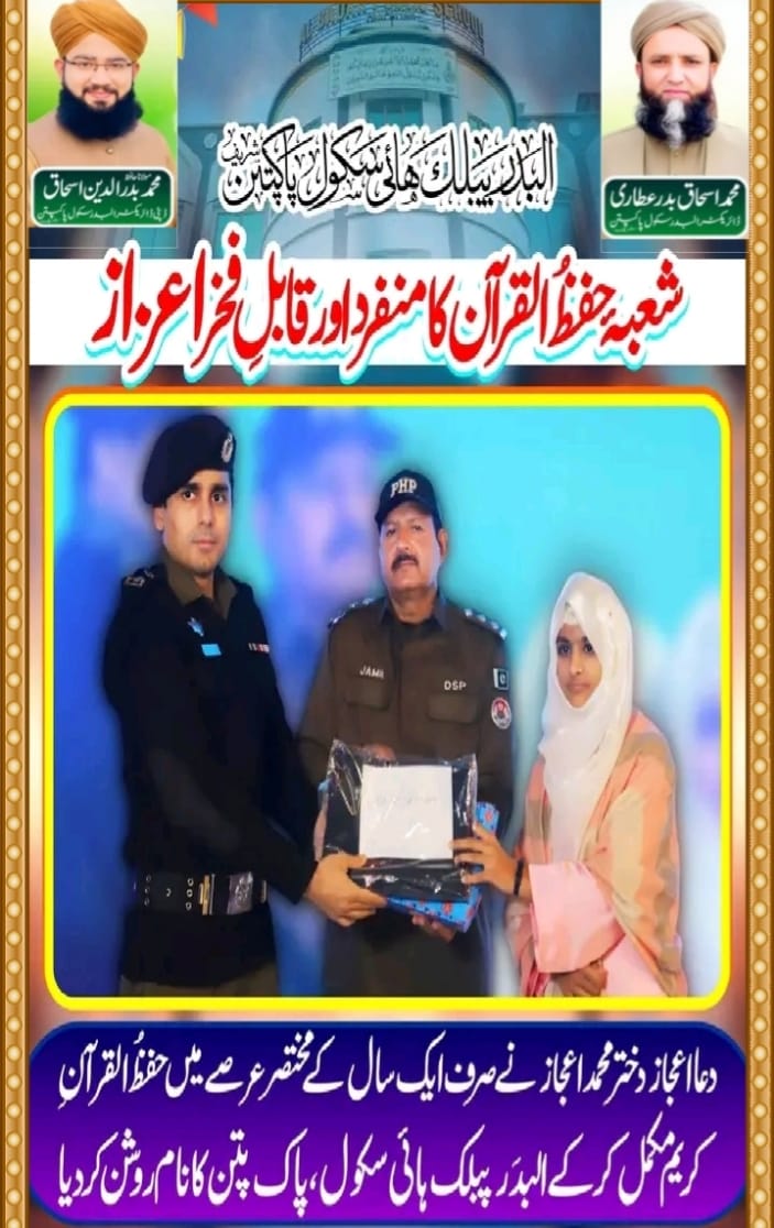 پاکپتن(ڈسٹرکٹ بیورو چیف)تفصیلات کے مطابق البدَر پبلک ہائی سکول پاکپتن نے شعبۂ حفظُ القرآن کا منفرد اور قابلِ فخر اعزاز حاصل کر لیا۔اللہ تعالیٰ کے فضل و کرم اور نبی رحمت صلی اللہ علیہ والہ وسلم کے لطف و عنایت سےدعا اعجاز دختر محمد اعجازنے صرف ایک سال کے مختصر عرصے میں حفظُ القرآنِ کریم مکمل کر کے البدَر پبلک ہائی سکول پاکپتن کا نام پنجاب بھر میں روشن کر دیا۔طالبہ کی شاندار دینی و تعلیمی کارکردگی کو سراہتے ہوئے ایڈیشنل آئی جی پنجاب پولیس نے پنجاب لیول پر ایک لاکھ روپے نقد انعام اور🏆 اعزازی شیلڈسے نوازا۔یہ کامیابی نہ صرف طالبہ بلکہ والدین اساتذہ اور ادارے کے لیے باعثِ فخر ہے۔اللہ تعالیٰدعا اعجاز کو علمِ نافع اور عملِ صالح کی توفیق عطا فرمائے۔ آمین۔اس اعزاز پر قاری خواجہ فیض فرید پیرزادہ نے البدر سکول کے اونر محترم جناب اسحاق بدر عطاری اور صاحبزادہ بدرالدین اسحاق کو خصوصی مبارکباد پیش کی اور نیک تمناؤں کا اظہار کیا۔قاری خوجہ صاحب نے کہا کہ یہ ادارہ عصری تعلیم کے ساتھ دینی تعلیم و تربیت کا ایک روشن مستقبل کی ضمانت ہے۔