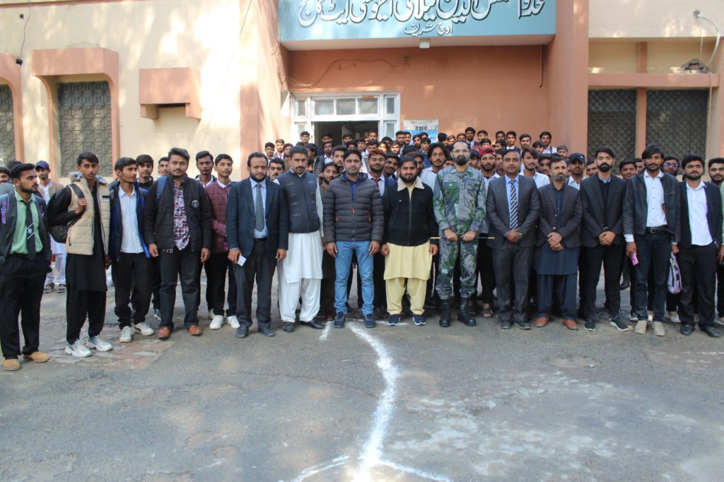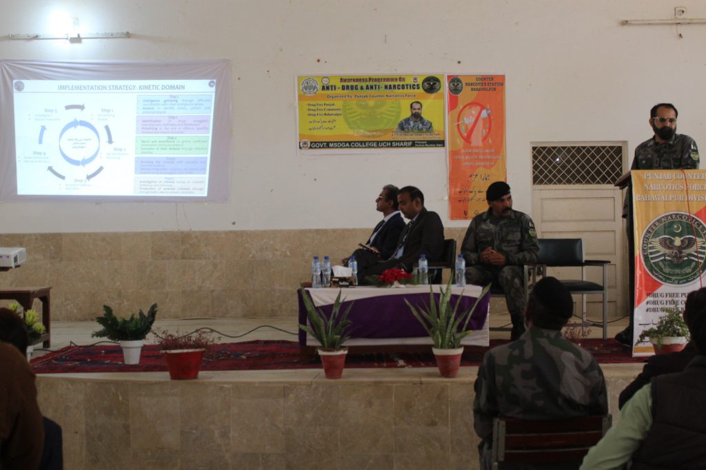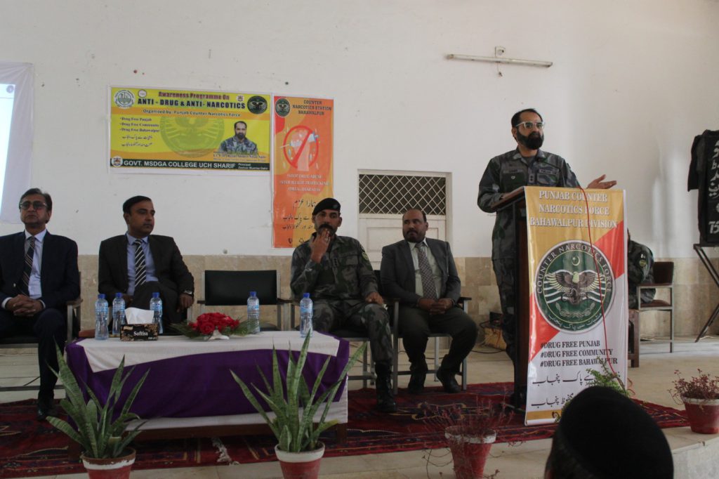 استعمال،اس کے نقصانات اور روک تھام کے ذرائع کو واضح کیا۔طلباء نے منشیات کے خاتمے کے لیے عملی اقدامات کے حوالے سے سوالات کیے۔ہال میں موجود اسٹیج سیکرٹری پروفیسر حافظ خالد محمود نے پاکستان زندہ باد اور منشیات کے خلاف فوری جنگ پنجاب کاونٹر نارکوٹکس فورس کے سنگ اور ڈرگ فری بہاولپور کےفلک شگاف نعرے لگوائے۔پرنسپل کالج ہذا پروفیسر ذیشان ممتاز ڈاھر نے اپنے معزز مہمانوں کا شکریہ ادا کیا۔تقریب کا اختتام قومی ترانے پر کیا گیا۔اس موقع پر انسپکٹر افتخار احمد اور ان کی ٹیم فورس کے ساتھ اساتذہ کرام میں پروفیسر محمد اجمل سیال، پروفیسر جام صفدر،پروفیسر ملک سہیل وارن،پروفیسر ملک وزیر رچنڑ کے ساتھ، کلاس فور ملازمین سمیت سٹوڈنٹس کی کثیر تعداد موجود تھی۔
