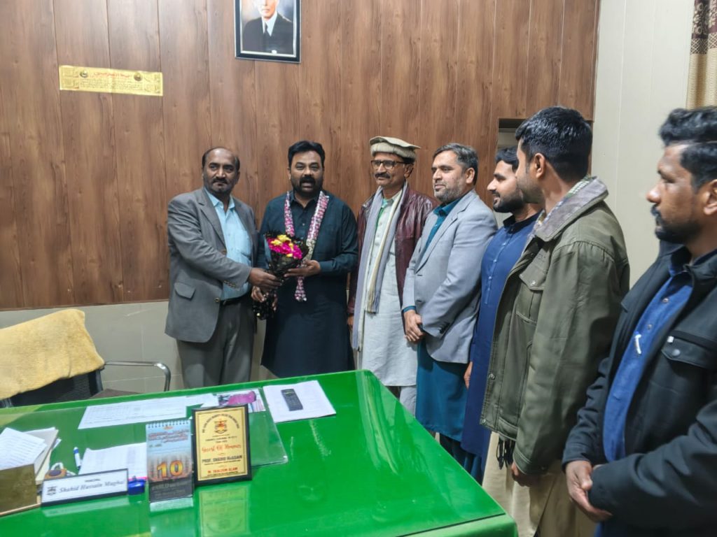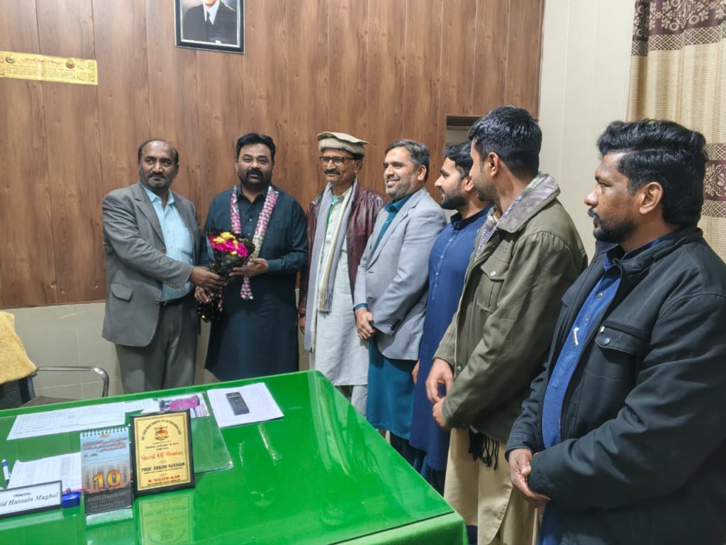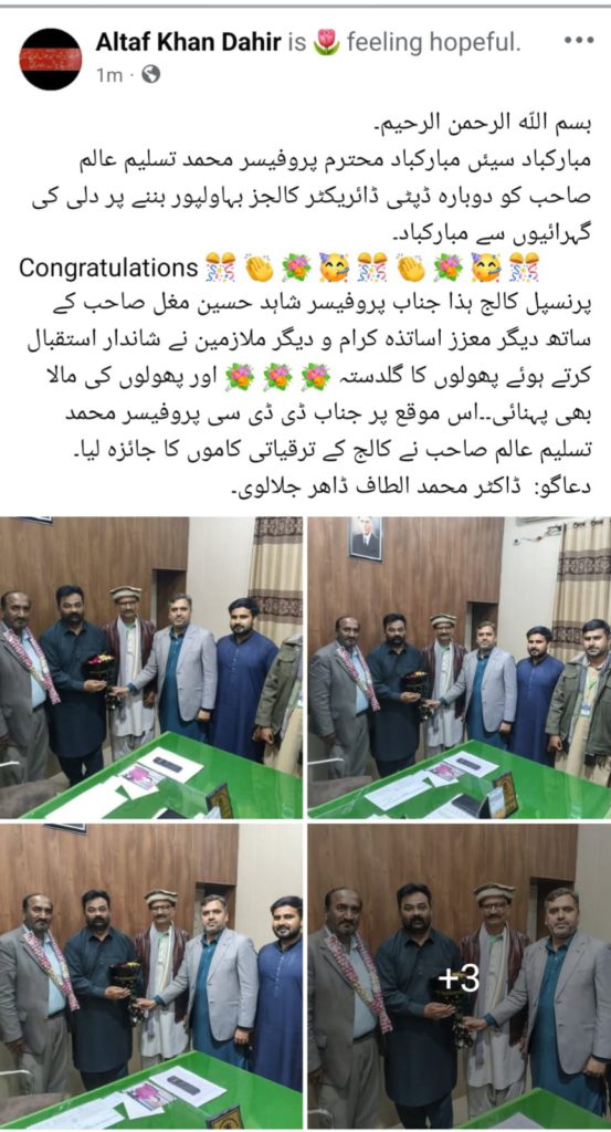 احمدپورشرقیہ( پ ر )حکومت پنجاب ہائیر ایجوکیشن ڈیپارٹمنٹ کے نوٹیفکیشن کے مطابق پروفیسر محمد تسلیم عالم نےبطور مستقل ڈپٹی ڈائریکٹر کالجز بہاولپور تعیناتی پر ڈسٹرکٹ بہاولپور کے مختلف کالجز کا اچانک تعلیمی،تدریسی،بیوٹیفیکیشن و دیگر ترقیاتی کاموں کا جائزہ لیتے ہوئے اطمینان کا اظہار کیا۔اس موقع پر انہوں نے گورنمنٹ صادق عباس گریجوایٹ کالج ڈیرہ نواب صاحب احمد پور شرقیہ کے اچانک دورہ کے دوران کالج ہذا میں تمام امتحانی داخلوں، صفائی ستھرائی و دیگر سکیورٹی امور کا خصوصی جائزہ لیتے ہوئے پرنسپل کالج پروفیسر شاہد حسین مغل،کنٹرولر امتحانات و انچارج سکیورٹی آفیسر پروفیسر ڈاکٹر محمد الطاف ڈاھر جلالوی کی دن رات عملی کاوشوں کو خوب سراہا۔اس موقع پرنسپل کالج ہذا پروفیسر شاہد حسین مغل نے دلی مبارک باد پیش کرتے ہوئے استقبالیہ کے ساتھ پھولوں کا گلدستہ و مالا پہنائی۔ڈی ڈی سی پروفیسر محمد تسلیم عالم نےکہا سرکاری کالجز ہی معیاری کالجز ہیں۔اعلی تعلیم وتربیت وجدید ٹیکنالوجی کی بدولت ملکی معیشت میں ترقی وخوشحالی ممکن ہے۔نوجوان نسل کو قلم وکتاب سے دوستی کرنی چاہیے۔اس موقع پر سی آٹی آئیز لیکچررز صاحبان میں رانا اسد علی،محمد عدنان خان،سپرنٹنڈنٹ جناب خالد رشید چشتی،آفس بوائے علی عباس،کلاس فور ملازمین میں نوید مرید،فیض درانی،طاہر گارڈ،ضیاء ملک،مونی لال بھی موجود تھے۔